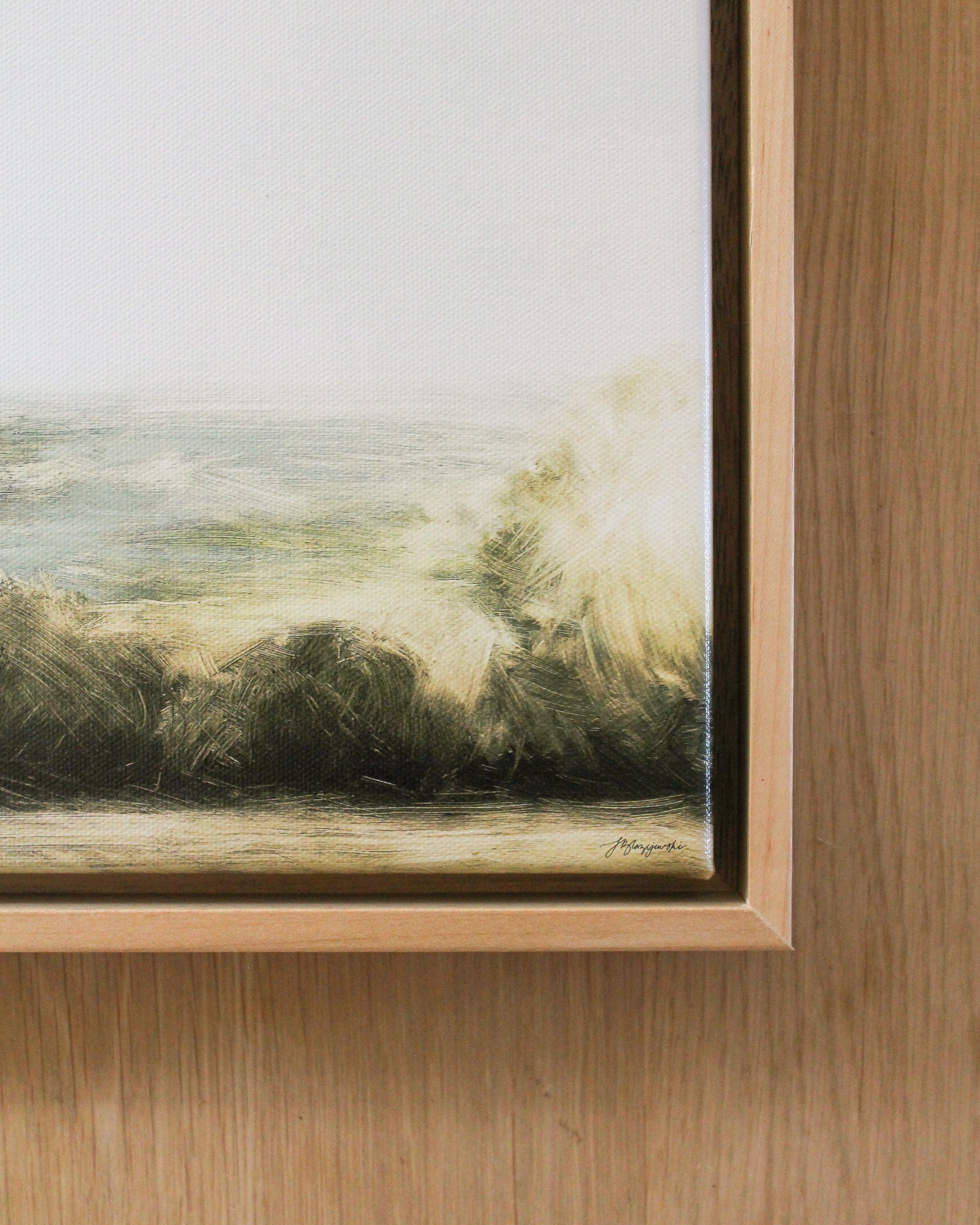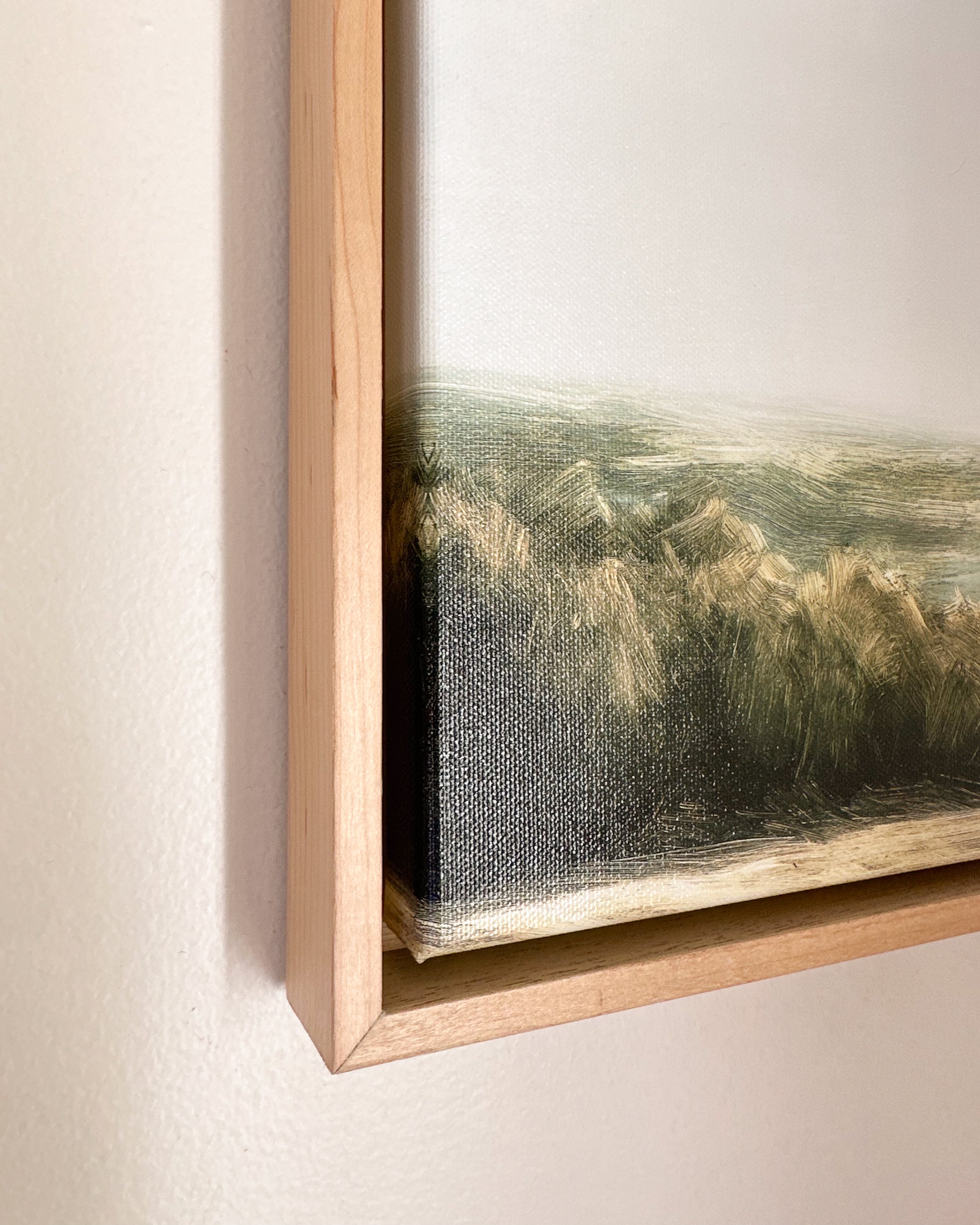 This is a giclée canvas print of an original oil painting, stretched over wooden bars and framed in a maple float frame.