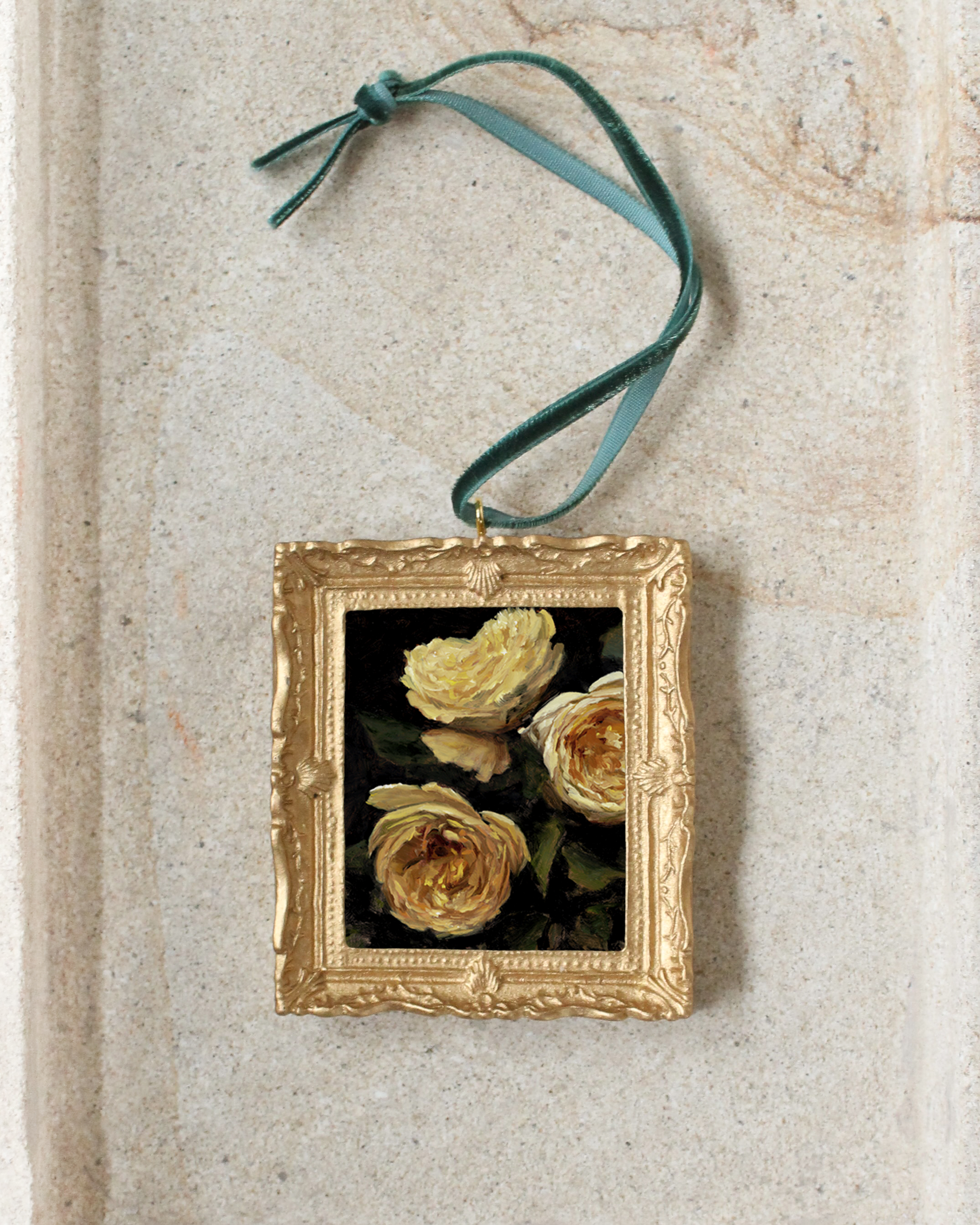 Each ornament is composed of a mini print of your choice, giclée printed on canvas paper, framed in a vintage style gold frame, and tied with a forest green velvet ribbon.