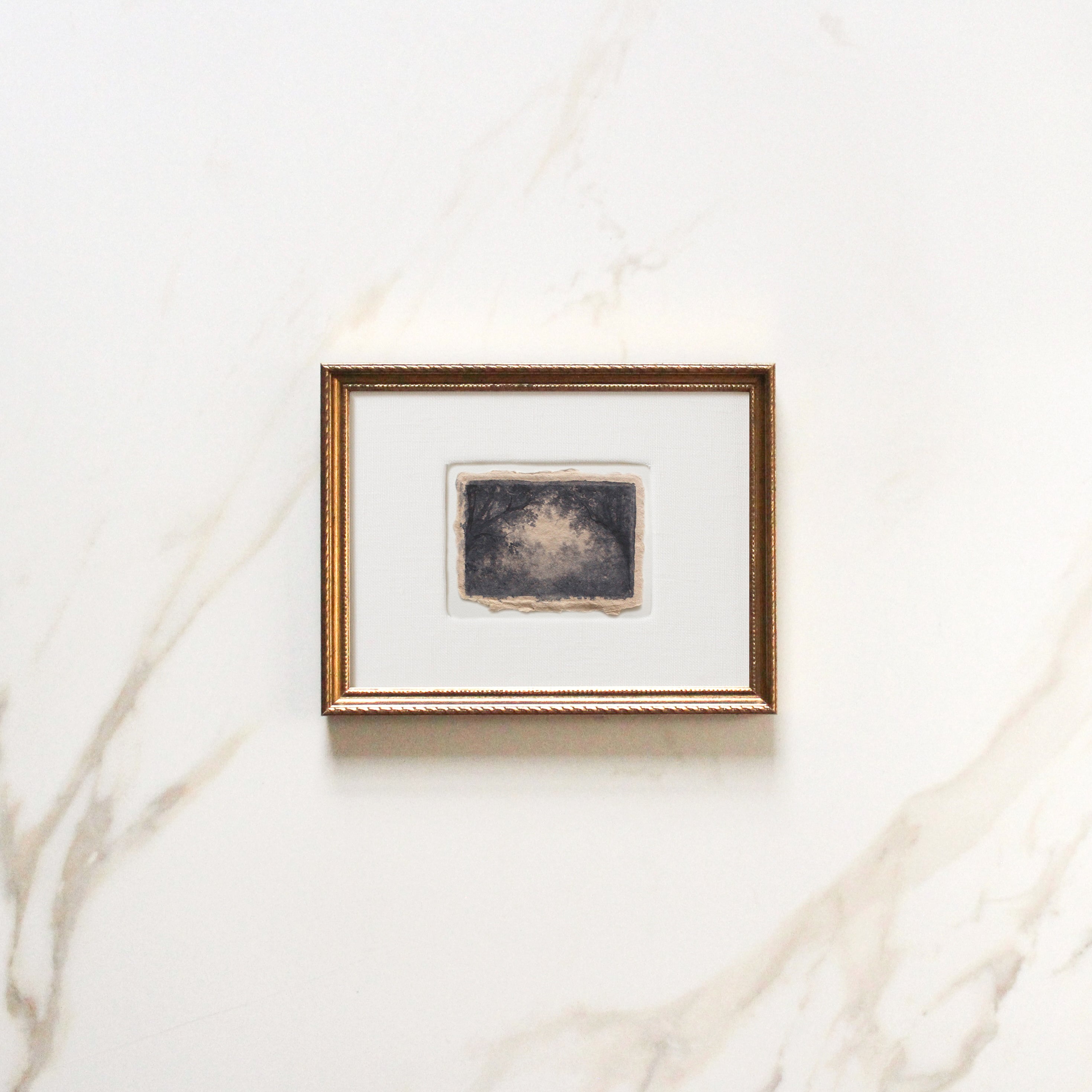 Painting is 2.5x3.5" in a 6x8" frame. This original painting is done in watercolor on handmade watercolor paper, matted in a linen-wrapped mat and framed in a gold vintage-style wooden frame with glass.